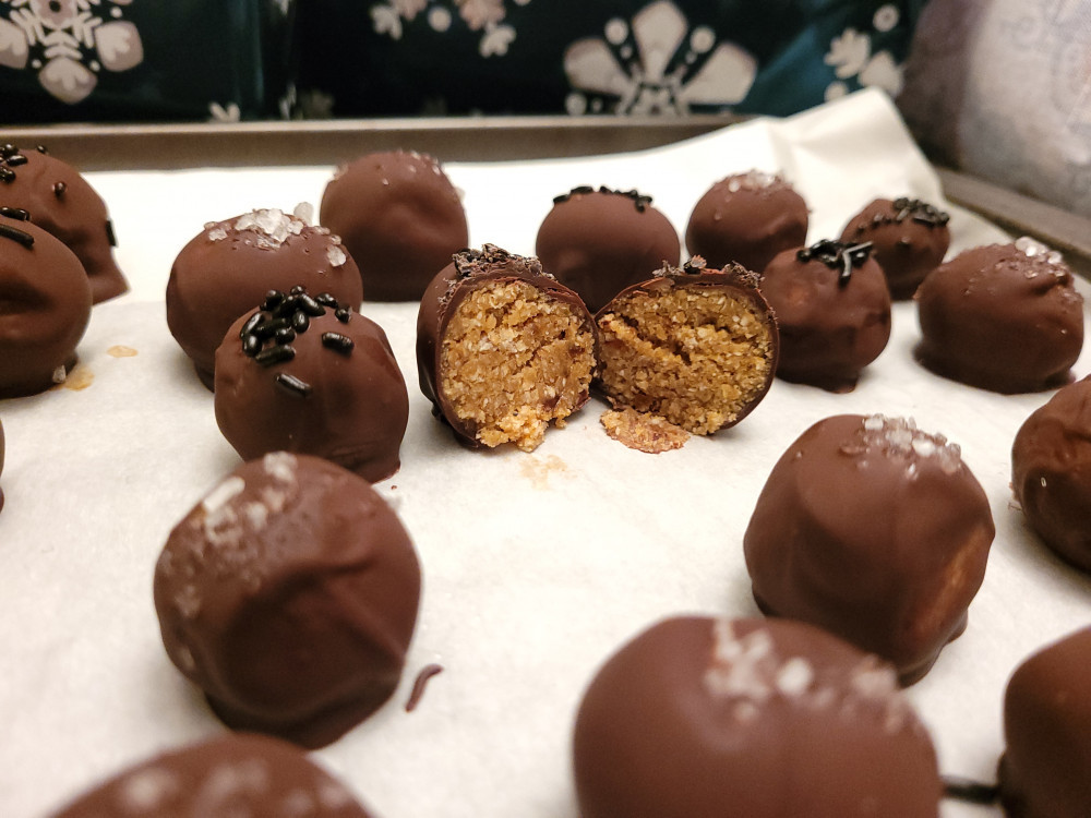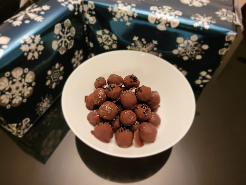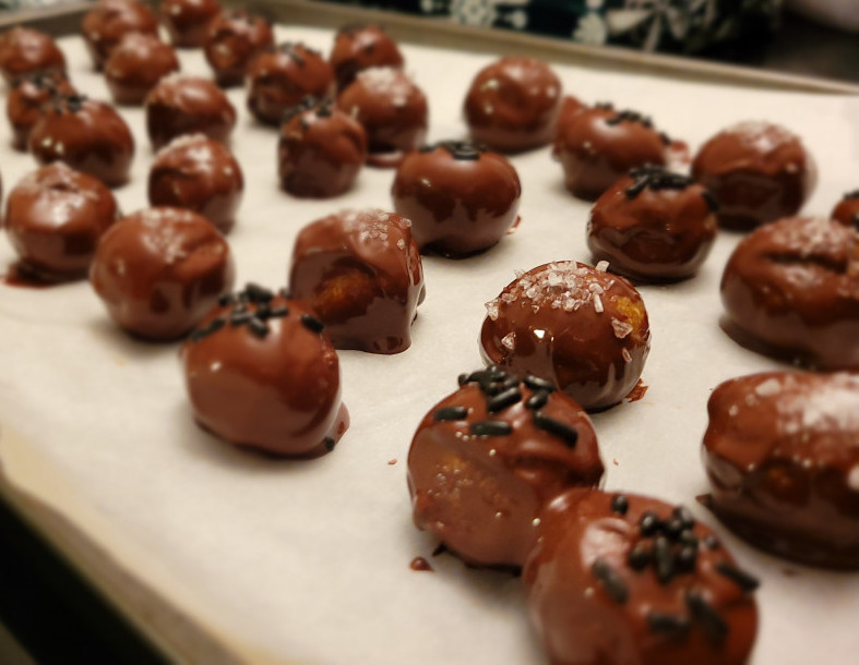 - Coat truffle balls with chocolate and sprinkle with sea salt and sprinkles.