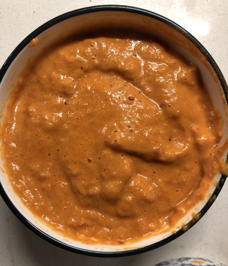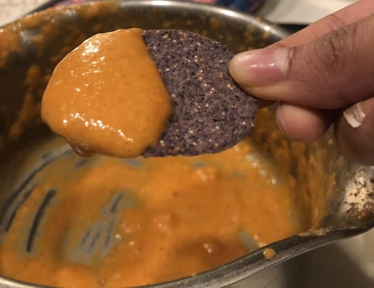 We’re going to start by pre heating our oven to 400 degrees Fahrenheit. Place your red peppers and garlic cloves on the oven safe tray. Start by sauteeing your onions on medium high heat and add in the nutritional yeast and spices. When the oven preheats dry roast your ingredients for 20-25 minutes until the skin blackens. Take the tray out of the oven and very carefully wrap the peppers while they are still hot in aluminum foil. This will sweat the peppers and make the skin easy to peel off. After about 10 minutes, you will be able to peel the skin away and get rid of the seeds in the middle. The garlic should be fragrant and easy to squeeze out of their pods after roasting. Throw everything together in a food processor or hand blend until no lumps remain. Add salt to taste.
