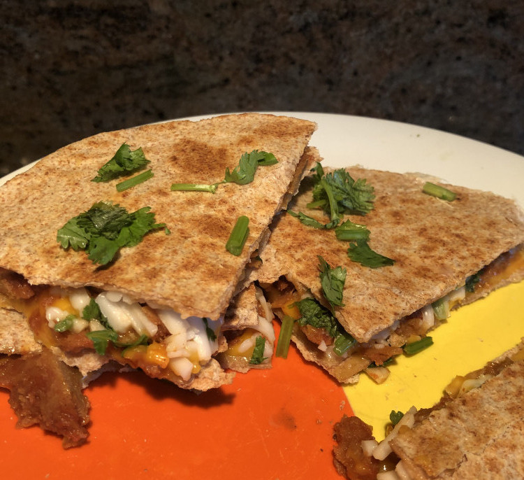 The preparation was super easy. I used 1 pack of their vegan pork to make two giant quesadillas. To clarify, I define one quesadilla as one entire tortilla at the base with another tortilla on top. I don’t fold a single tortilla on itself.