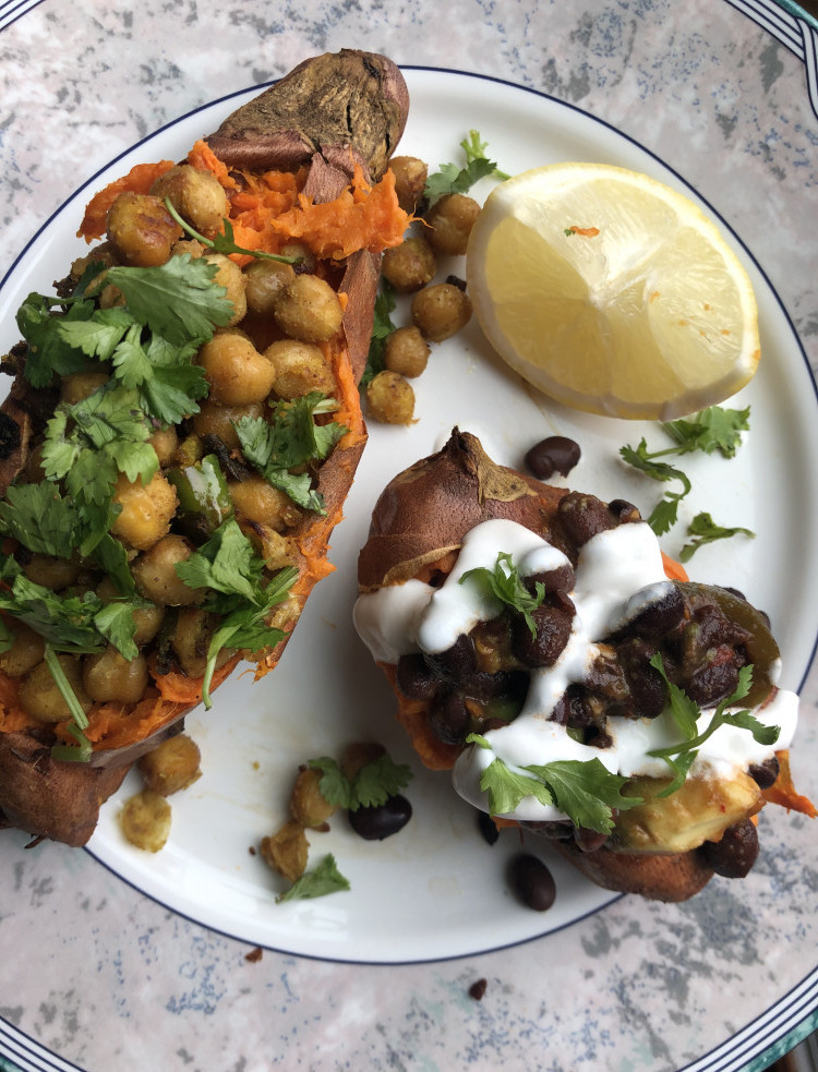 But not to worry, because these stuffed sweet potatoes have got you covered on all fronts. The sweet potato itself has complex carbs, fiber, and starches that fill you up and keep you full! And the fillings, one made with black beans and avocado, and the other made with curried chickpeas, add to the protein and healthy fat content of this dish.