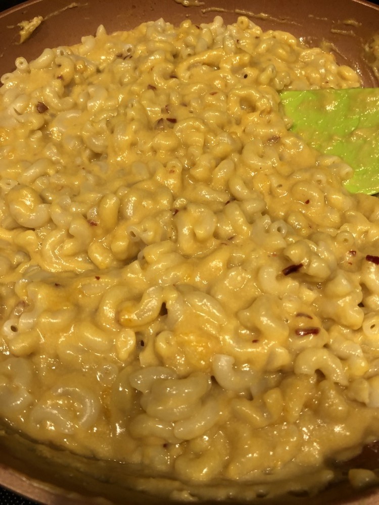 I start out with a good chunk of vegan butter (I love Earth Balance buttery sticks!), melt it down in a large nonstick pan and add flour to thicken with no lumps. Then we gradually add in our plant milk. I highly recommend pea protein milk by Ripple. It is by far the most delicious milk (including dairy milk) I have ever tasted and so incredibly creamy. We’re going to whip up a nice roux as our base for our creamy cheesy sauce. Next, I cut up small blocks of Daiya’s vegan cheddar cheese and add it into the mix. The vegan cheese takes a little longer to melt so don’t just throw the giant block in the pot and wait. Cutting it up really helps. Next comes our nutritional yeast aka our nutty parmesan flavored powerhouse of micronutrients. Now we wait for a few minutes, stirring continuously until everything has melted down and we are left with a thick sauce. Voila! Our (I can’t believe it’s vegan) sauce is done! Add your favorite macaroni or shells or other short pasta and enjoy!