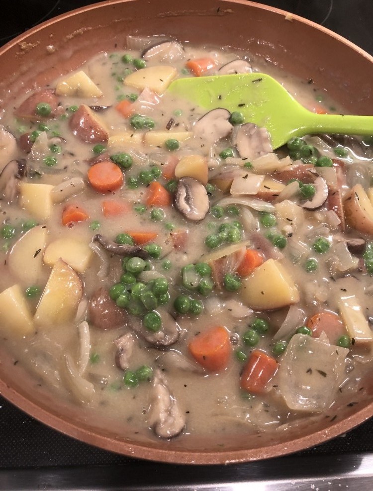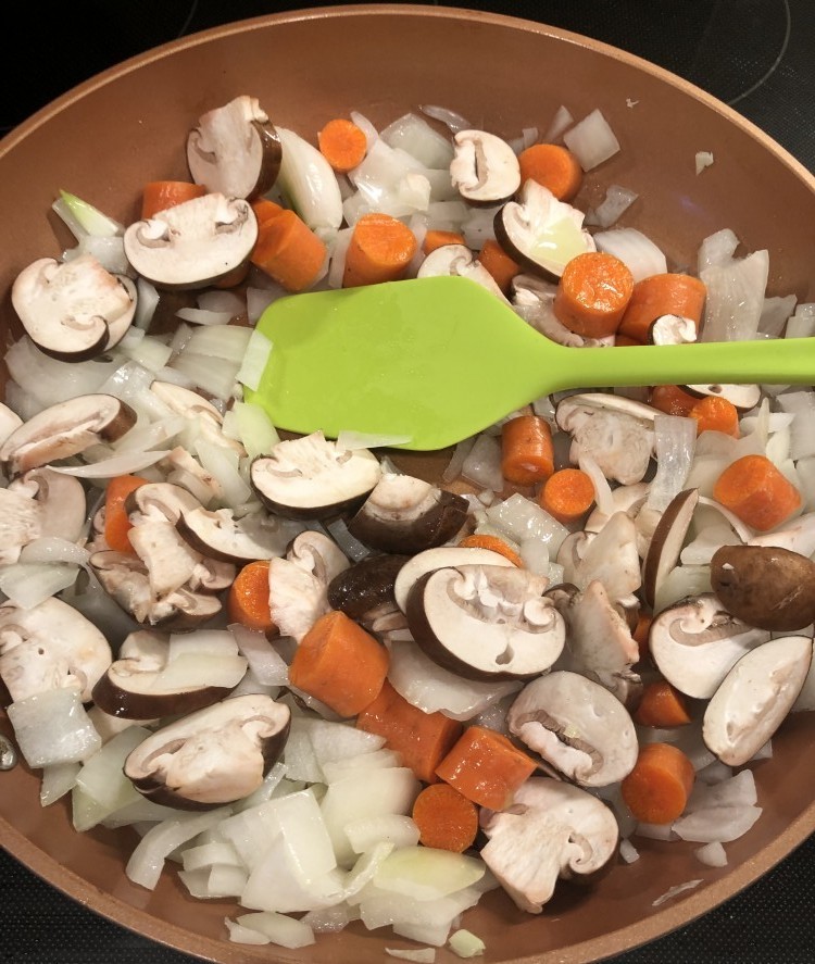 - Add in sliced mushrooms, potatoes, and carrots and continue cooking until mushrooms have reduced in size.