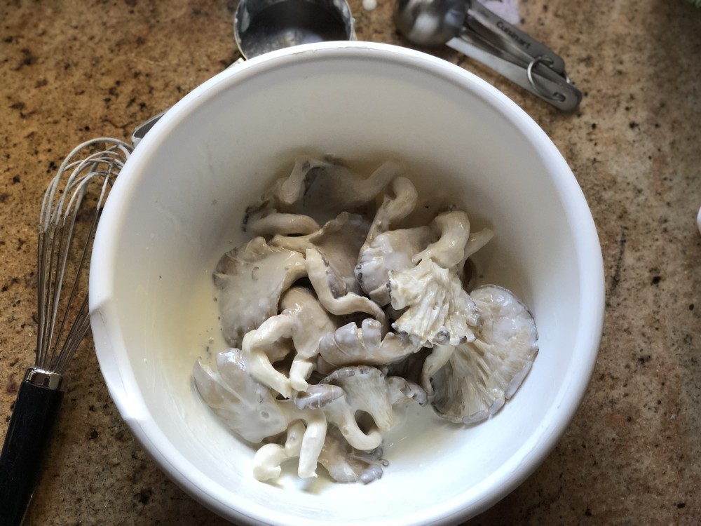 3. Wash and dry your mushrooms and put them into the mixture. Coat eat mushroom thoroughly and cover and marinate for half an hour.