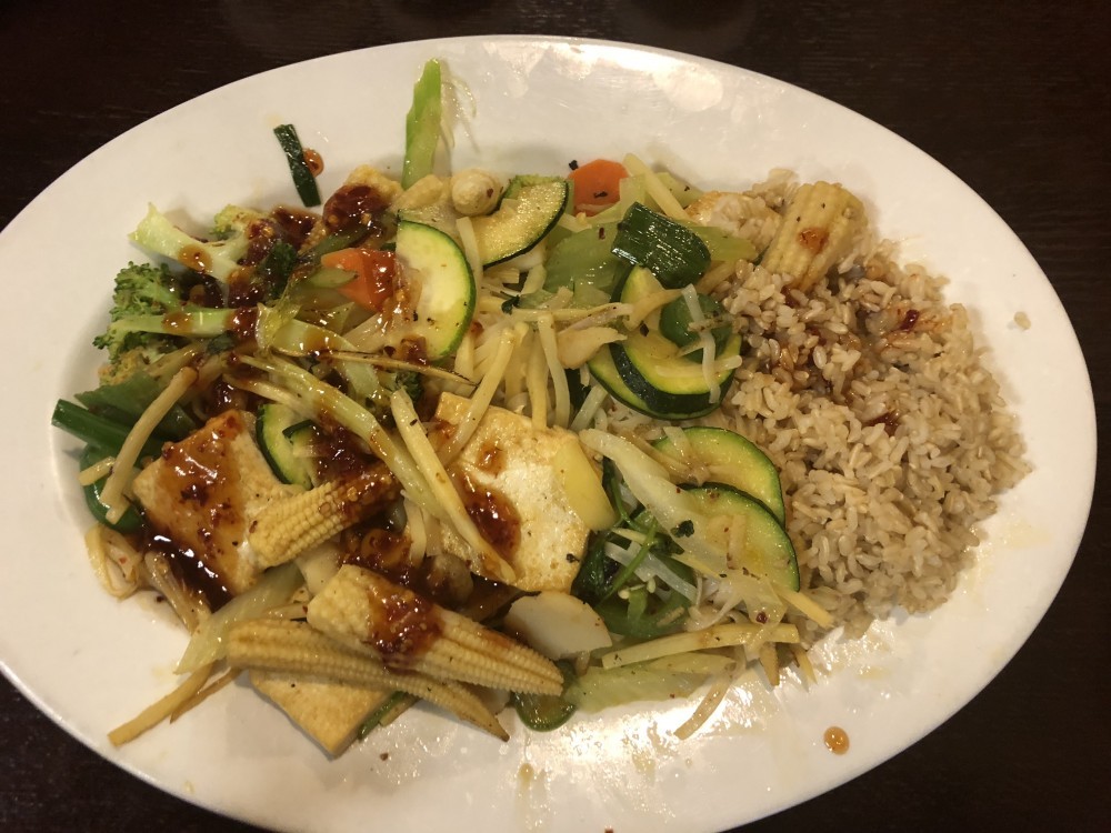 So, basically you walk in and self serve a bunch of fresh veggies, including carrots, broccoli, baby corn, zucchini, bok choy, etc. I remember piling my bowl so high that one wrong movement and it would have all come crashing down 😉 Next, I remember taking that bowl to the counter, where they would saute your concoction right in front of you and a protein option (for vegetarians: tofu or eggs). Anyway, now for the fun part: sauces! This place has such an amazing array of sauces, from spicy, to sweet, to sweet and sour. This time, I chose extra Spicy Mongolian sauce and plum sauce. 100% recommend the Mongolian sauce – totally packs a punch!